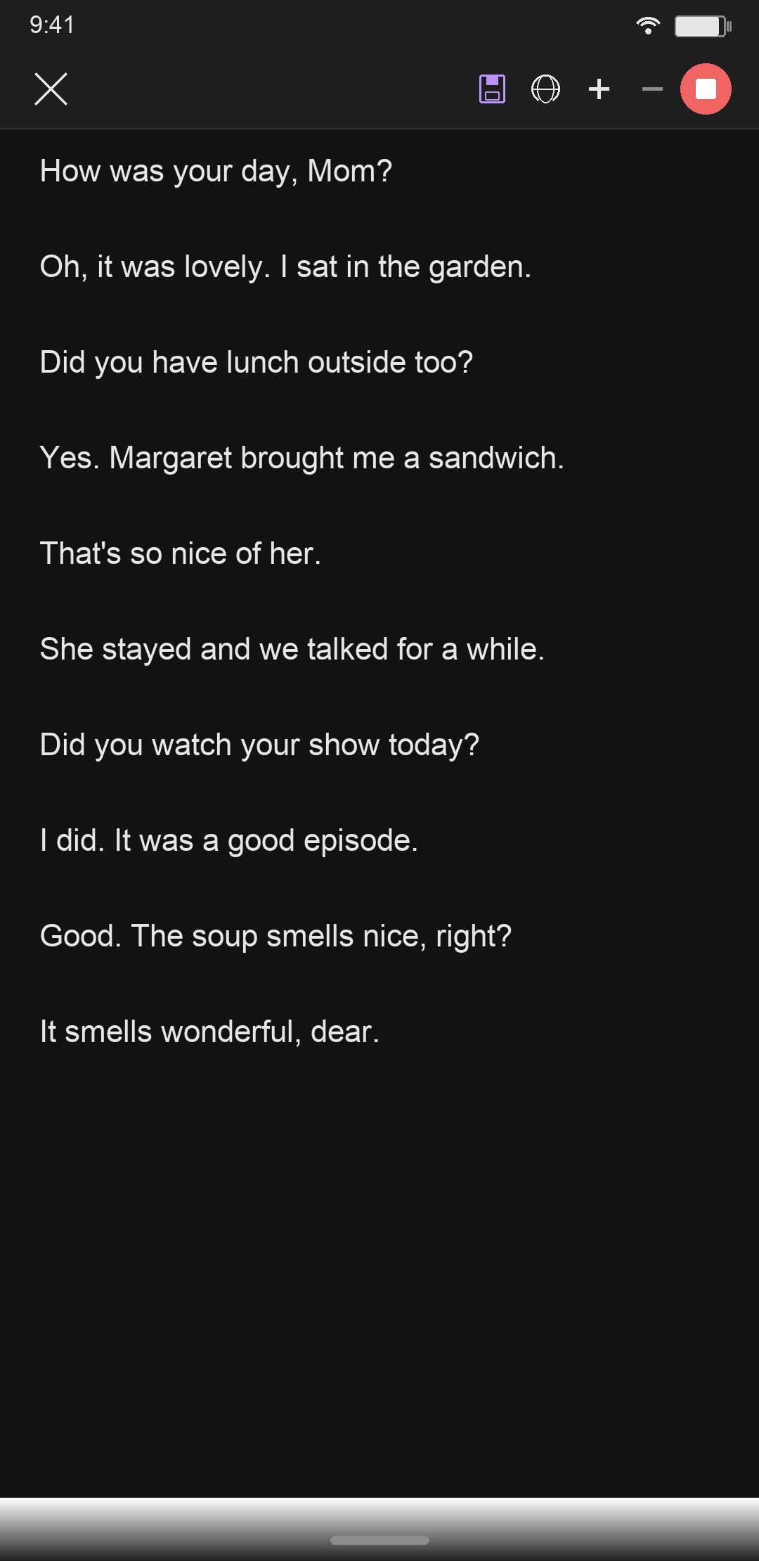 Use this feature to create notes by talking to the app, and to transcribe conversations to text and display them. When hearing aids are not sufficient, this feature can help seniors follow a conversation on the dinner table. Put the phone in a cradle in front of the senior and launch this feature. The senior can follow the conversation by reading the transcribed text on the phone.